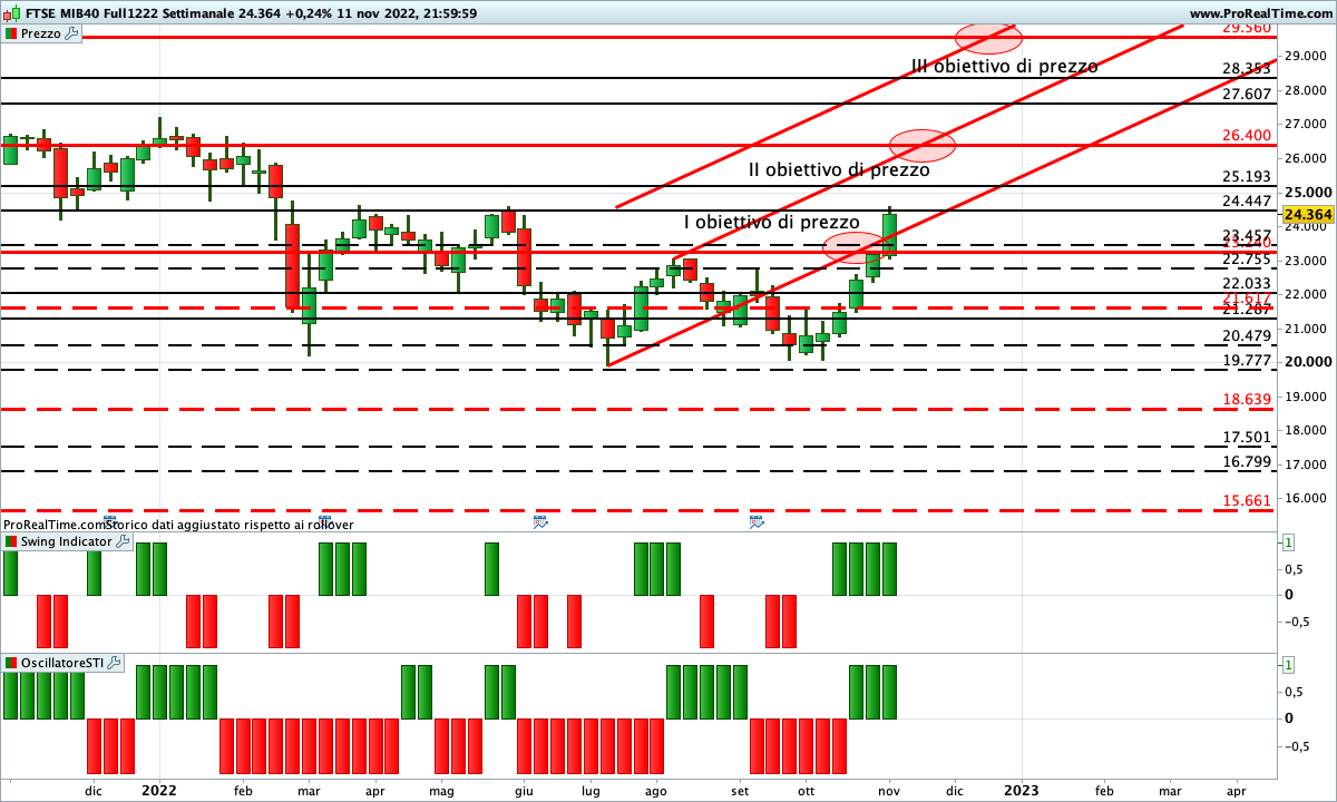Con la chiusura settimanale abbiamo avuto la conferma, da parte dei nostri indicatori proprietari, della rottura della resistenza in area 23.240 (I obiettivo di prezzo). Si potrebbero, quindi, essere creati i presupposti per una continuazione del rialzo fino in area 26.400 (II obiettivo di prezzo) e successivamente fino in area 29.560 (III obiettivo di prezzo). A guardare bene il grafico una conferma in tal senso potrebbe arrivare da una chiusura settimanale superiore a 24.450.